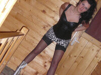 Slutty Housewife wearing a Skin Tight Fitted Shiny Rubber Latex Skirt and Shiny Stockings Ready For Cock Sucking and Anal Sex